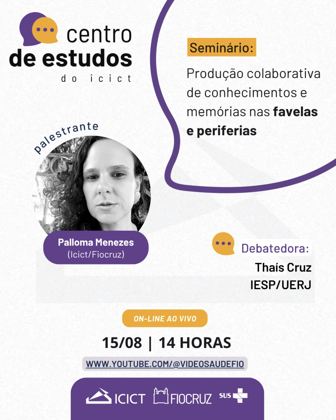 O Centro de Estudos do ICICT promove, mensalmente, eventos técnico-científicos que dialogam sobre temas da informação, comunicação e saúde para toda a comunidade científica abertos a toda comunidade, sem necessidade de inscrições. A próxima sessão será na sexta-feira, dia 15/8, com a pesquisadora Palloma Menezes, que falará sobre “Produção colaborativa de conhecimentos e memórias nas favelas e periferias”. A transmissão é ao vivo pelo canal da VideoSaúde Distribuidora. Orientações pelo e-mail do programa: centrodeestudos@icict.fiocruz.br.