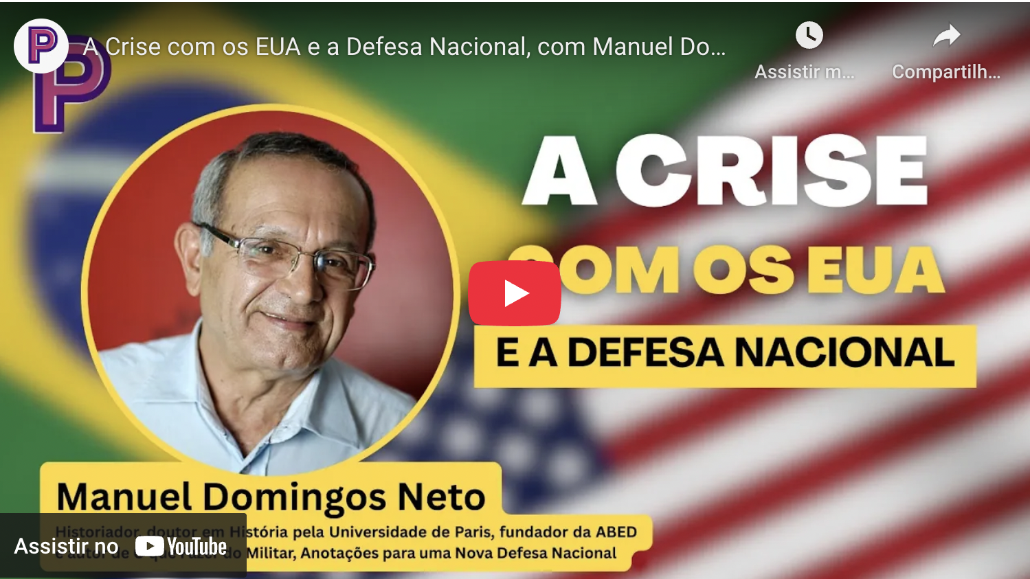 Já está disponível no canal Ponto de Partida das Ideias, o vídeo "A crise com os EUA e a defesa nacional", com Manuel Domingos Neto, historiador, doutor em História pela Universidade de Paris e membro fundador da ABED (Associação Brasileira de Estudos de Defesa), autor do livro "O que fazer do militar, anotações para uma nova defesa nacional". A apresentação é de Marcelo Barbosa. Assista aqui!