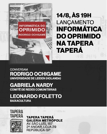 Será lançado na próxima quinta-feira, dia 14, na Tapera Taperá, em São Paulo, "Informática do Oprimido", de Rodrigo Ochigame. Alternativas Tecnológicas do Sul Global é o tema do livro, que resgata uma história das bibliotecas de Cuba e da rede de Intercomunicação da Teologia da Libertação, nos anos 1970-1980. A Tapera Taperá fica na Galeria Metrópolo (Av. São Luis, 187 - República).