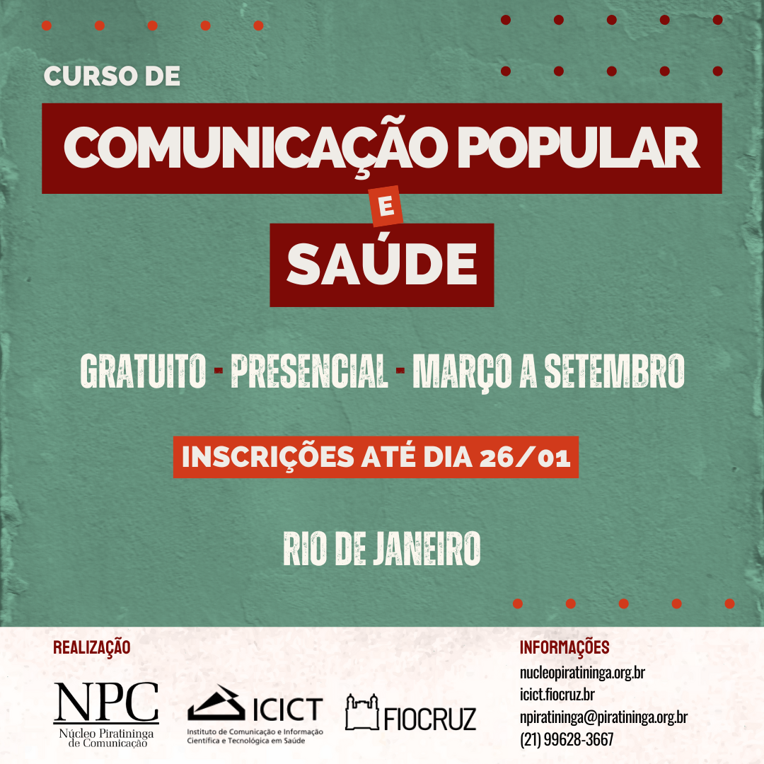 Chegou a hora! Estão abertas, até o dia 26/01 (segunda-feira), as inscrições para a edição 2026 do Curso Comunicação Popular e Direito à Saúde, que este ano será realizado por uma parceria do Núcleo Piratininga de Comunicação (NPC) e o Instituto de Comunicação e Informação Científica e Tecnológica em Saúde (ICICT), da Fundação Oswaldo Cruz (Fiocruz).  O curso é gratuito e será realizado entre os dias 14 de março e 7 de setembro de 2026. Ao todo serão 12 encontros presenciais, aos sábados, de 15 em 15 dias, no centro do Rio de Janeiro. Ao longo das aulas, vamos falar sobre temas como a comunicação popular e a saúde coletiva no Brasil; a relação entre esses dois campos; suas formas de convivência e fortalecimento mútuo; os desafios existentes e as possibilidades de atuação a partir desses dois campos. | Acesse e saiba como se inscrever!