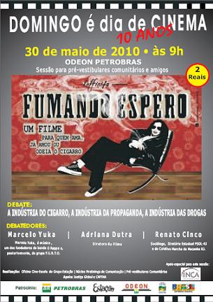 A próxima sessão do Domingo é Dia de Cinema será no dia 30/05, com um debate sobre as indústrias do cigarro, da propaganda e das drogas. O filme que será exibido é Fumando Espero, um documentário que mostra todos os lados do tema do tabagismo. O vídeo, dirigido por Adriana Dutra, mostra a trajetória do tabagismo na sociedade dos séculos 20 e 21. Formadores de opinião, artistas, pesquisadores, publicitários, funcionários públicos, advogados, vítimas da dependência, crianças, além de médico especialista e psicólogo falam de sua relação com a nicotina.
